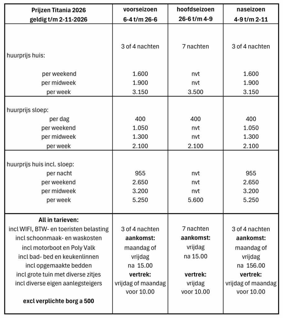Tarieven 2025 voor vakantiehuis Titania Friesland